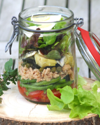 Ingrediënten: slavinaigrette, rode ui, tomatenblokjes, sperziebonen, tonijn natuur, kappertjes, zwarte olijven, artisjokharten, ansjovis in olijfolie, eikenbladsla, basilicum, tijm, gekookt ei
